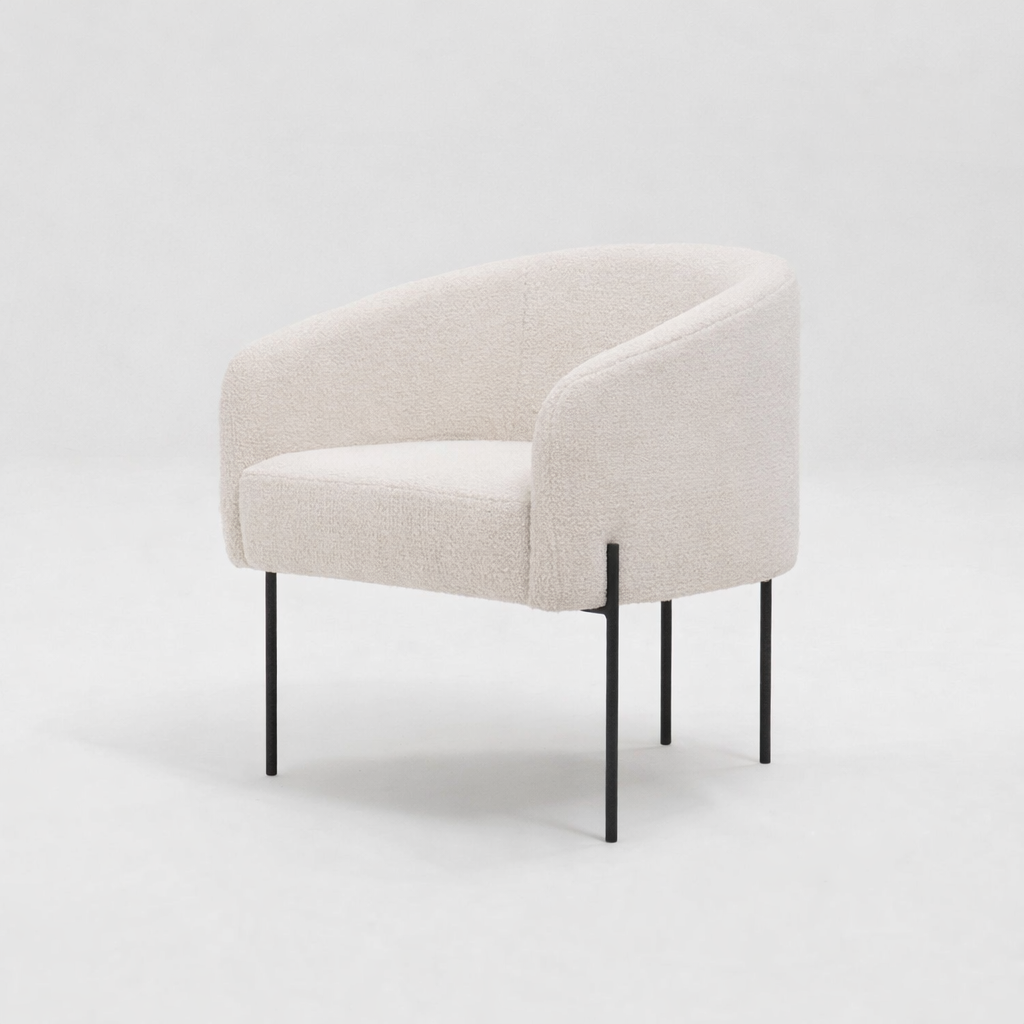 O assento generoso e o estofamento contínuo garantem conforto no uso diário, enquanto a base metálica de linhas finas confere leveza ao conjunto, elevando o produto do chão com elegância. O contraste entre o volume do estofado e a estrutura esbelta resulta em uma poltrona versátil, que se adapta com naturalidade a projetos residenciais e corporativos de alto padrão.