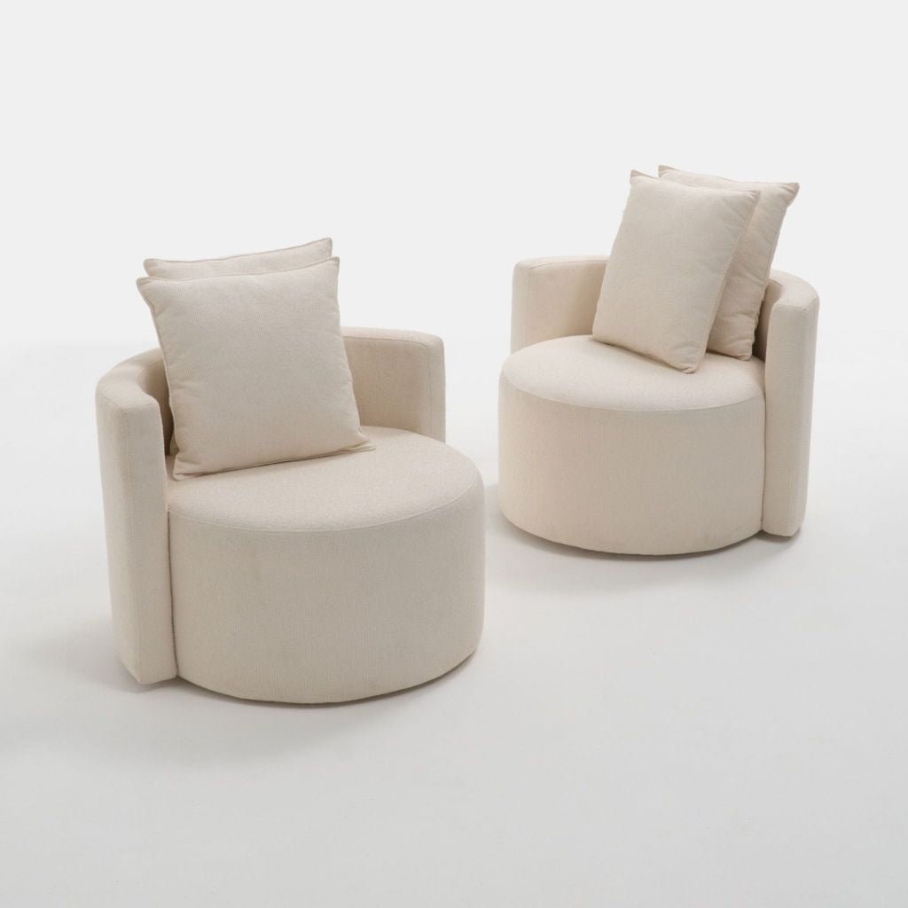 O assento circular e generoso proporciona conforto e liberdade de uso, enquanto o encosto com braço integrado oferece apoio funcional sem comprometer a leveza visual do conjunto. O estofamento contínuo reforça a sensação de suavidade e unidade, destacando a poltrona como um elemento elegante em diferentes composições de ambiente.